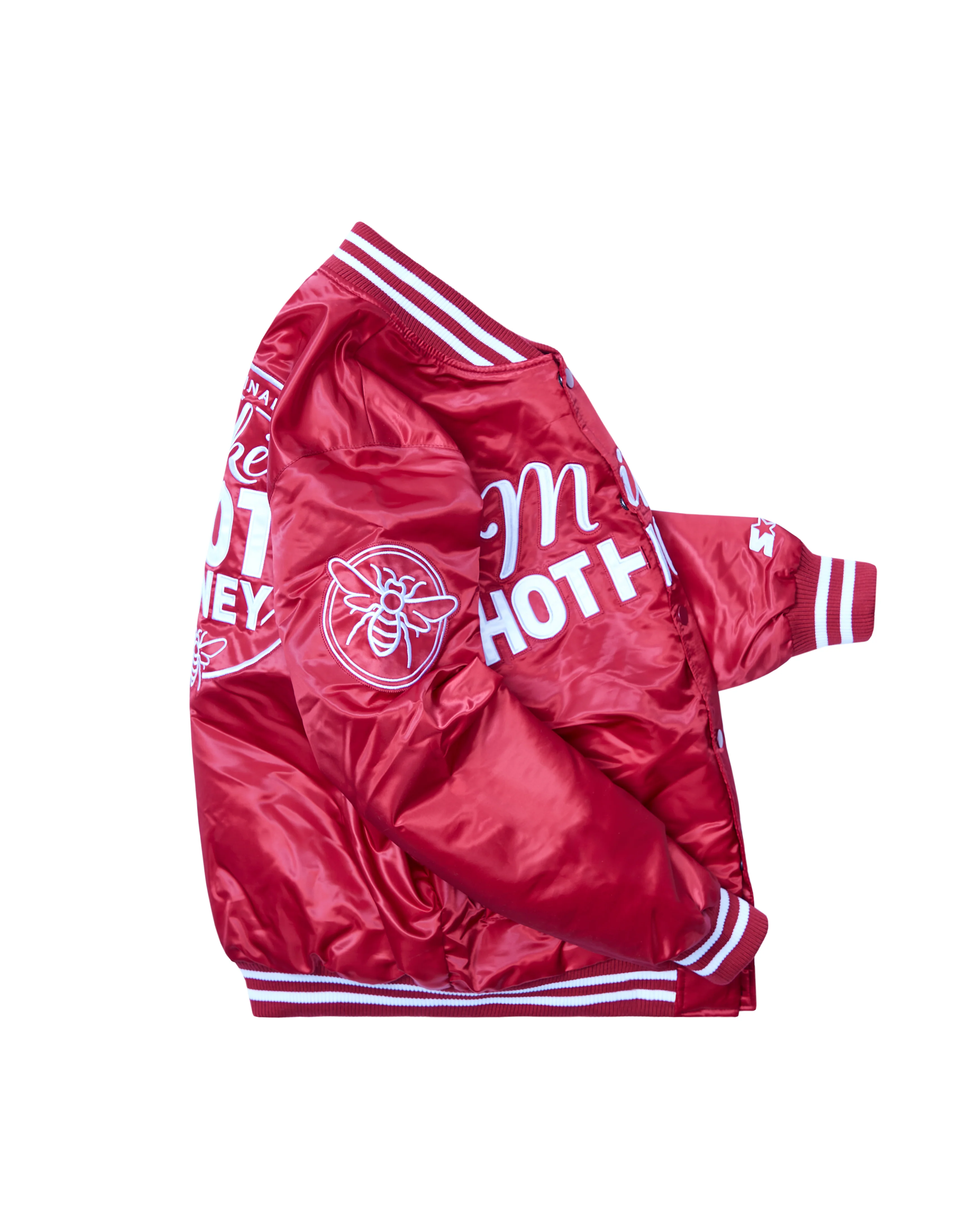 The Starter x Mike's Hot Honey varsity jacket features Starter's iconic satin, varsity jacket silhouette, used for officially licensed apparel with dozens of professional sports teams since the early 1970s, in a red/white, holiday colorway with the Mike's Hot Honey logo embroidered across the front chest.